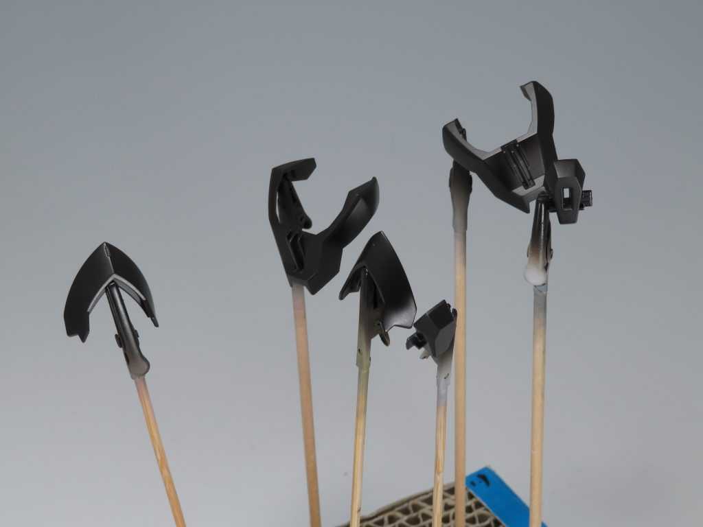 この後スミ入れをしてつや消しクリアーを吹いたらグレーのパーツは完成になります。