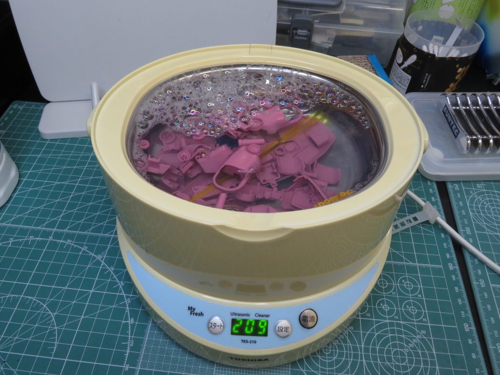 まず、パーツを塗装する前に表面処理等で出た削りカスを落としてキレイにするため、超音波洗浄機でパーツを洗っていきます。