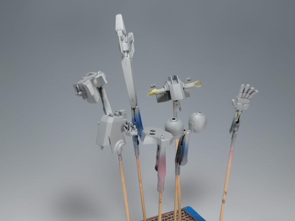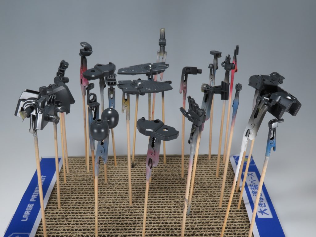 この後スミ入れをしてつや消しクリアーを吹いたらグレーのパーツは完成になります。